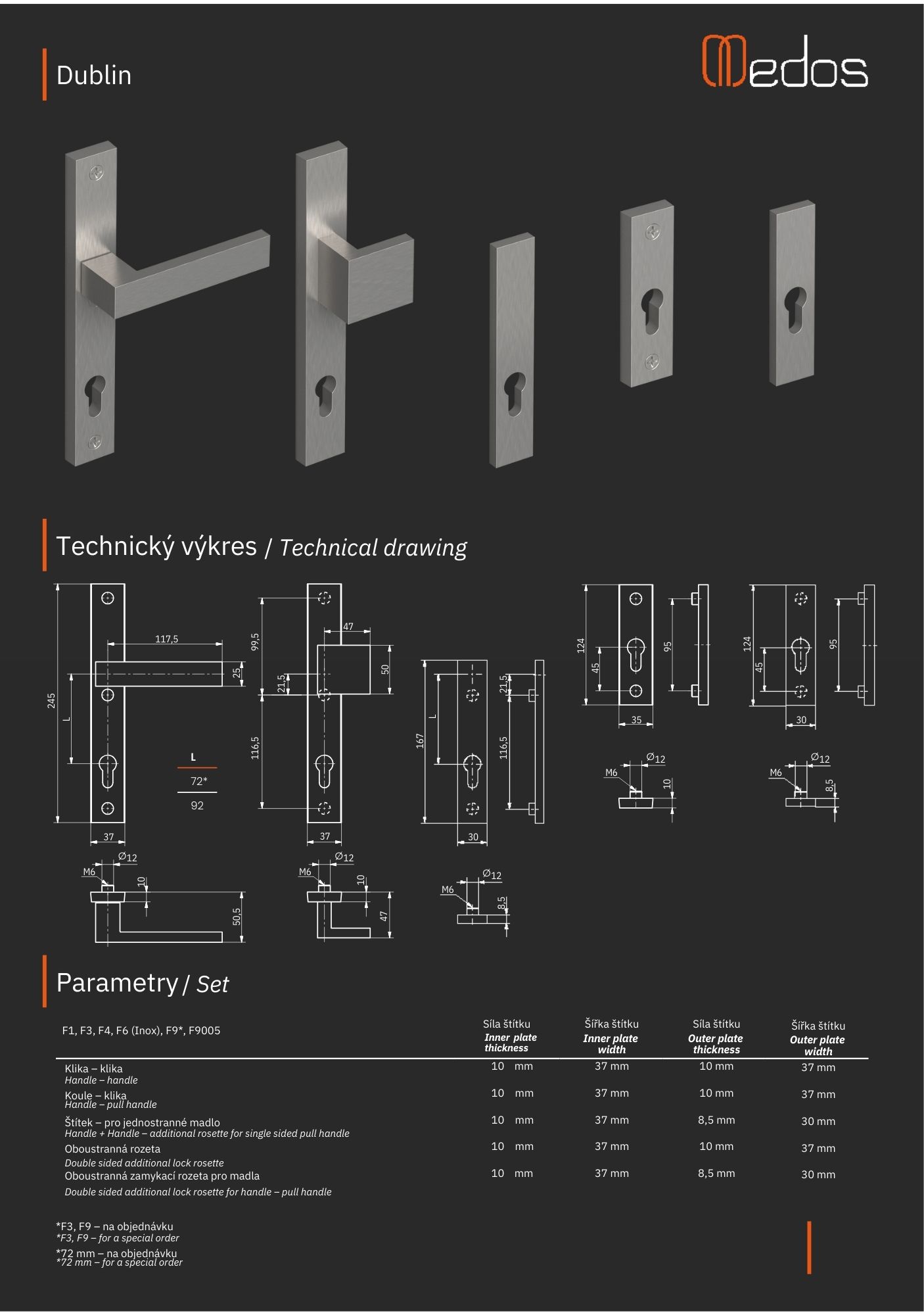 Dveřní kování klika-klika tradičního výrobce kování Medos v atraktivním hranatém provedení řady Dublin. Vyrobeno z extrudovaného hliníku pro vnější dveře o šířce 71-86 mm. Šířka štítku 37mm se zakrytými šrouby a roztečí 92mm bez zakrytí vložky. Vratná pružina pro přesnou polohu kliky a hladký pohyb kliky. Kompletní sada včetně čtyřhranu o délce 128 mm a upevňovacího materiálu.