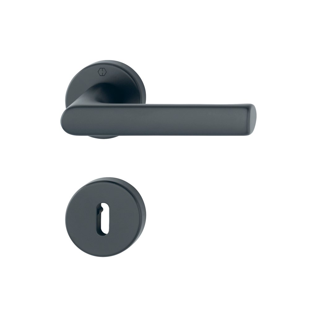 Sada hliníkových rozetových klik HOPPE Hamburg pro interiérové dveře, s rozetami na obyčejný klíč.