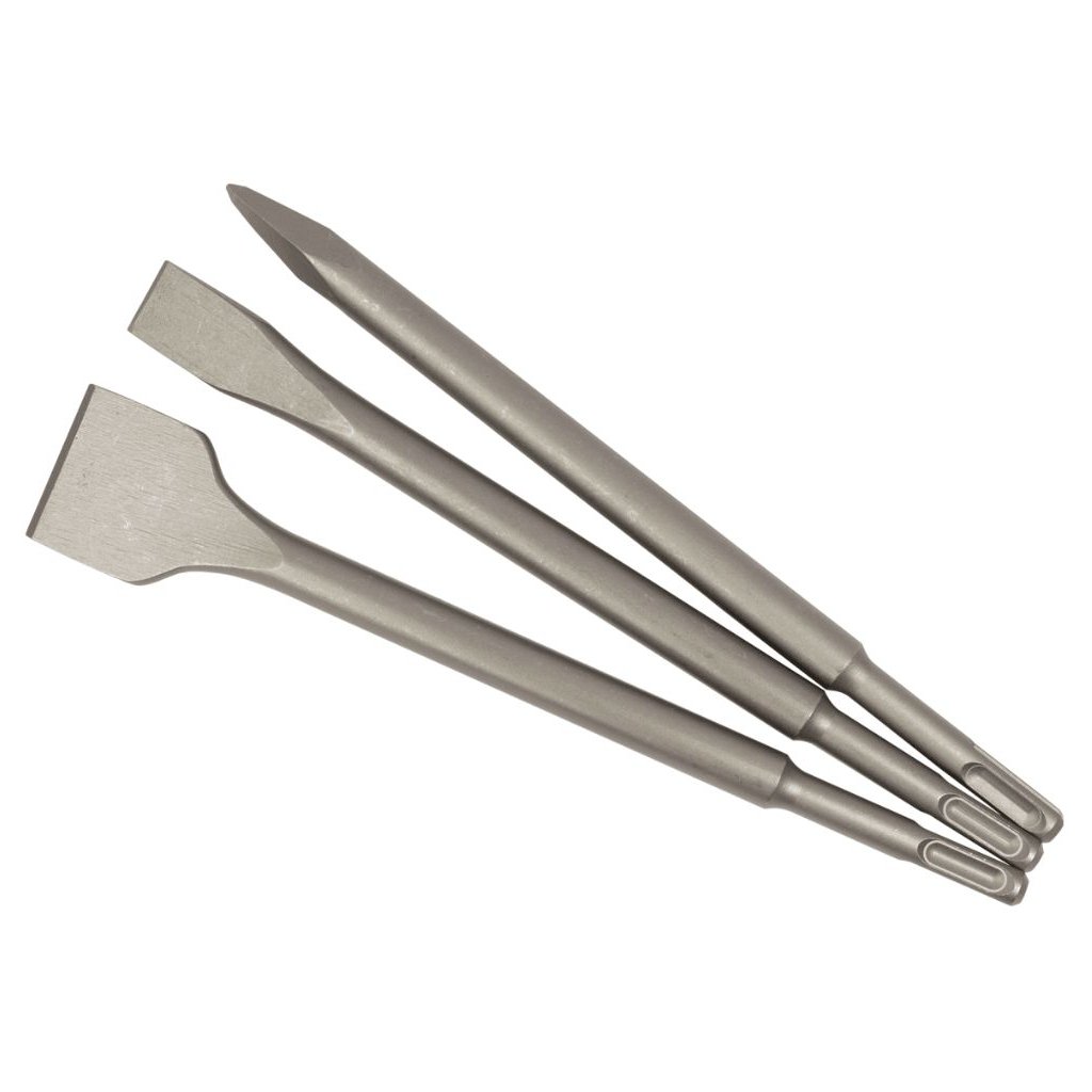 Každý sekáč je vyroben z tvrzené nástrojové oceli, která zajišťuje vysokou odolnost proti opotřebení, dlouhou životnost a efektivní přenos rázové energie. Díky kombinaci tří různých tvarů je sada vhodná pro bodové rozrušování, přesné sekání i plošné odstraňování materiálu.